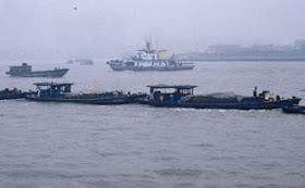 After leaving the tourist office, we set out on foot to meet a young Chinese girl, Chen Ci, and her father, acquaintances of our American friends, who had offered to show us around. We had arranged to meet them at the door of the Peace Hotel on the Bund. [The Shanghai Bund, on the banks of the Huangpo river, was the financial hub of East Asia at the end of the 19th and beginning of the 20th centuries, with imposing structures that housed banks and foreign offices. Today it is a commercial center with a walk and park along the river.] At first we walked along city streets, where people spilled out onto the sidewalk in front of small shops. They were cleaning vegetables, washing clothes and dishes, sitting on chairs and playing cards, tending small gardens planted around the trees next to the street. Our route was clearly not one that foreigners usually took and eyes followed our every move. At the end of the street we found ourselves at the river about a half mile south of the Bund, so we walked north until the riverfront became a park. In the river were a variety of watercraft–from sightseeing boats and ocean going vessels to barges and sampans. The weather was so smoggy and overcast that everything disappeared into a grey Turneresque mist not far from shore.